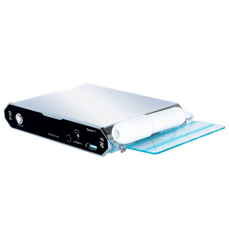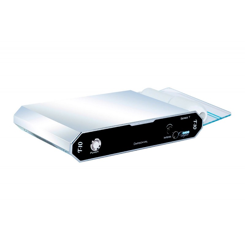 High frequency machine T-10 works in conjunctions with high frequency electrodes which are made of clear tempered glass and come in a variety different shapes and sized to facilitate the treatment of various areas of face and body. When the high frequency electrode is firmly inserted into the high frequency handpiece, a gentle alternating electrical current is generateed by the high frequency machine which then passes through the attached glass electrode upon contact with the skin. This contact ignites the inert gas within the electrode which produces healing electrical light energy and unstable oxygen which instantly converts into purifying ozon. In other words, when mixed with the air outside of the electrode, the electrical current infuses the skin with rejuvenating oxygen molecules and a therapeutic tingling sensation is experienced.